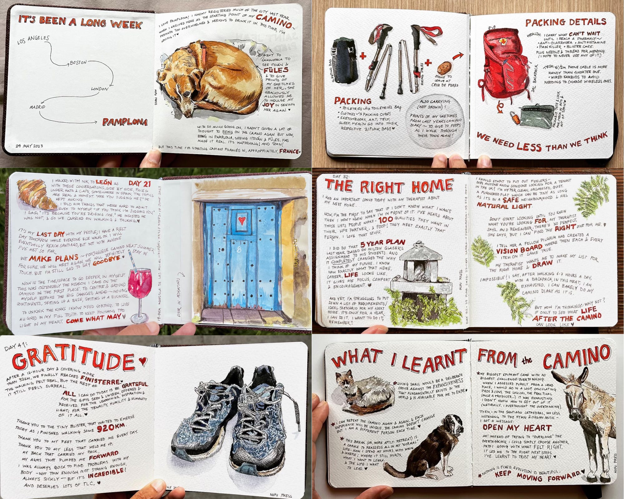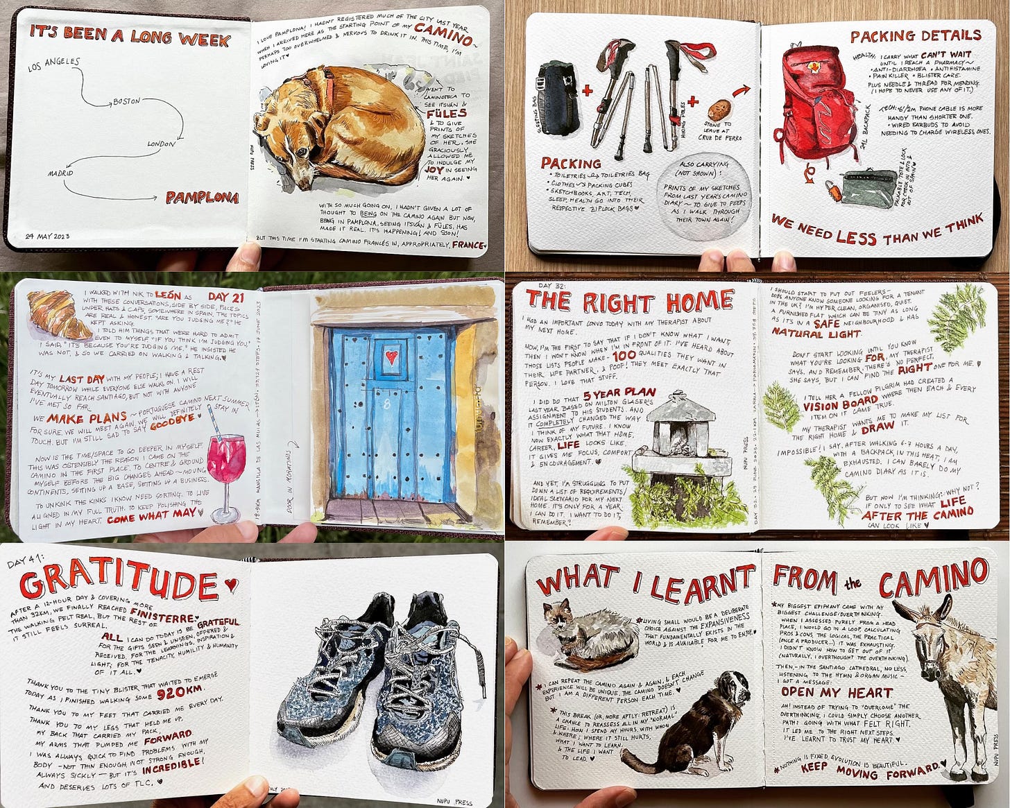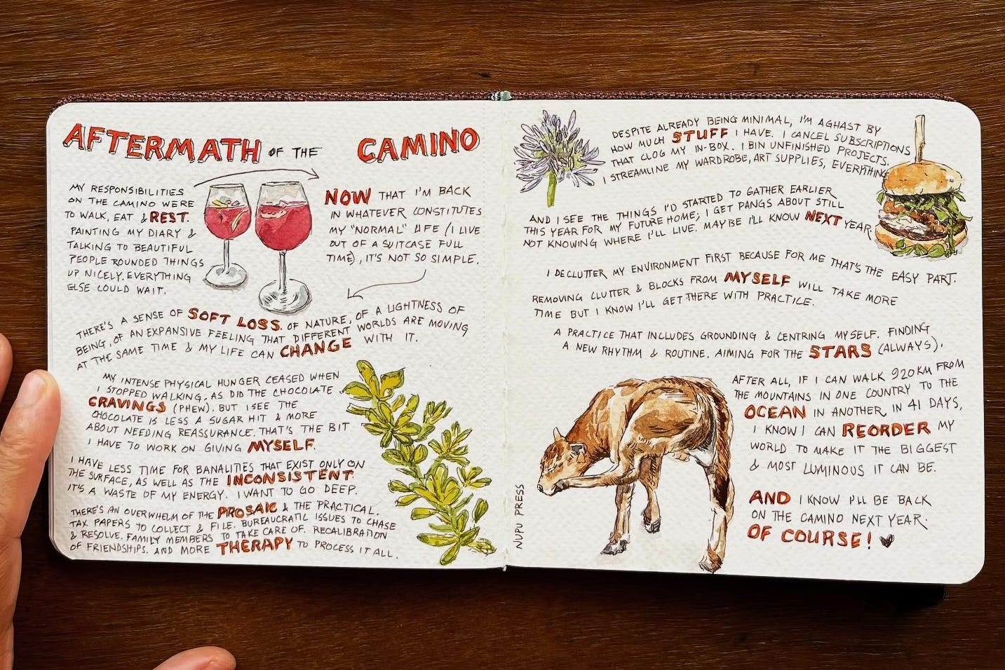 I walked the Camino de Santiago in Spain in 2022 for the first time, and kept a sketchbook diary throughout. I wasn’t sure at the beginning if I would – I allowed myself plenty of excuses to bow out of it – but I found myself craving that time to go and process my day on the page.