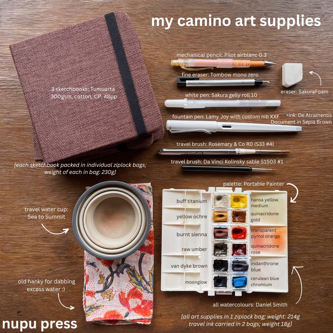Art supplies make me swoon. I geek out on them. They’re my most treasured possessions along with my sketchbooks. This is what I carried on the camino: